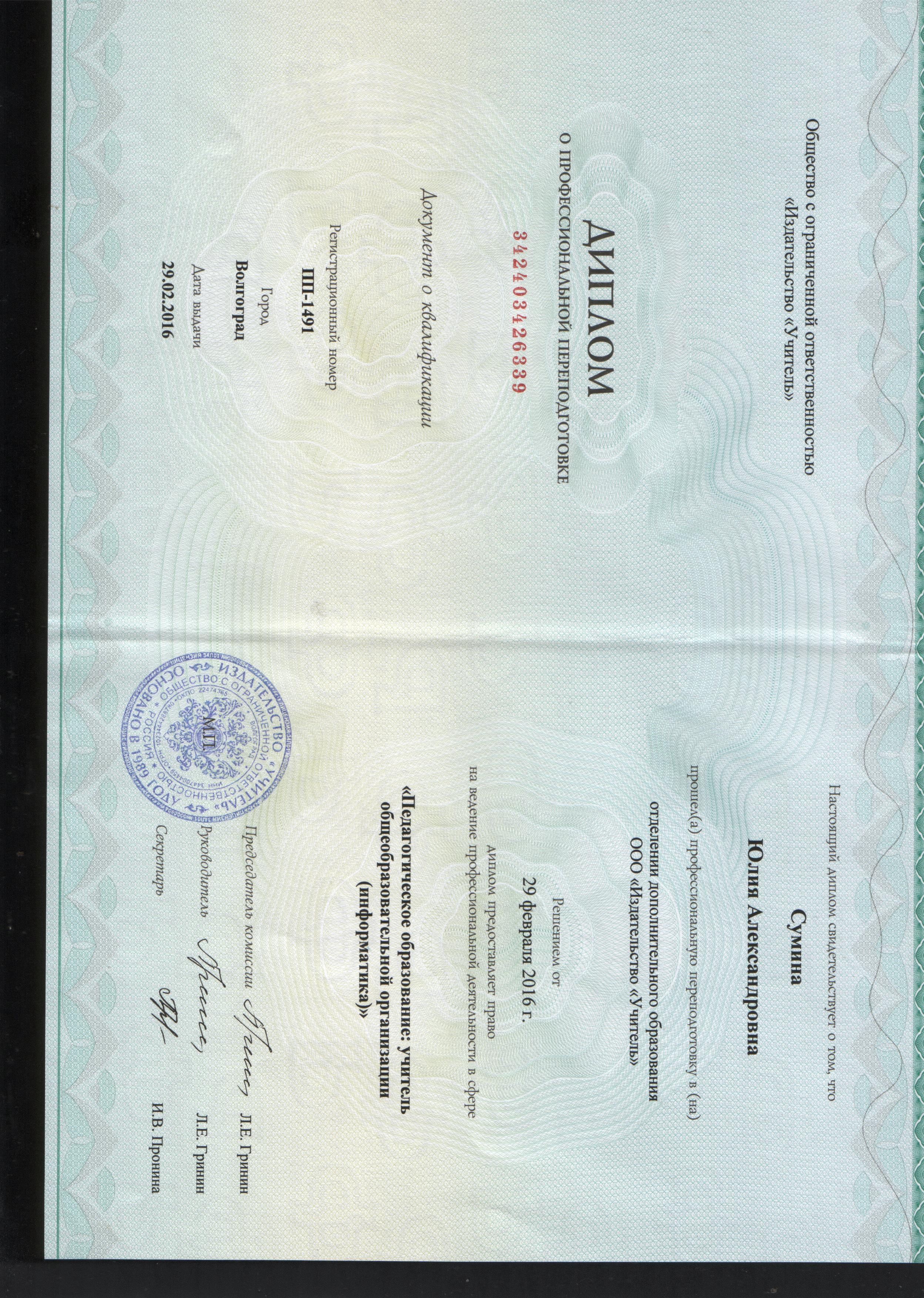 Полученная специальность: педагогическое образование: учитель общеобразовательной организации (информатика) документ